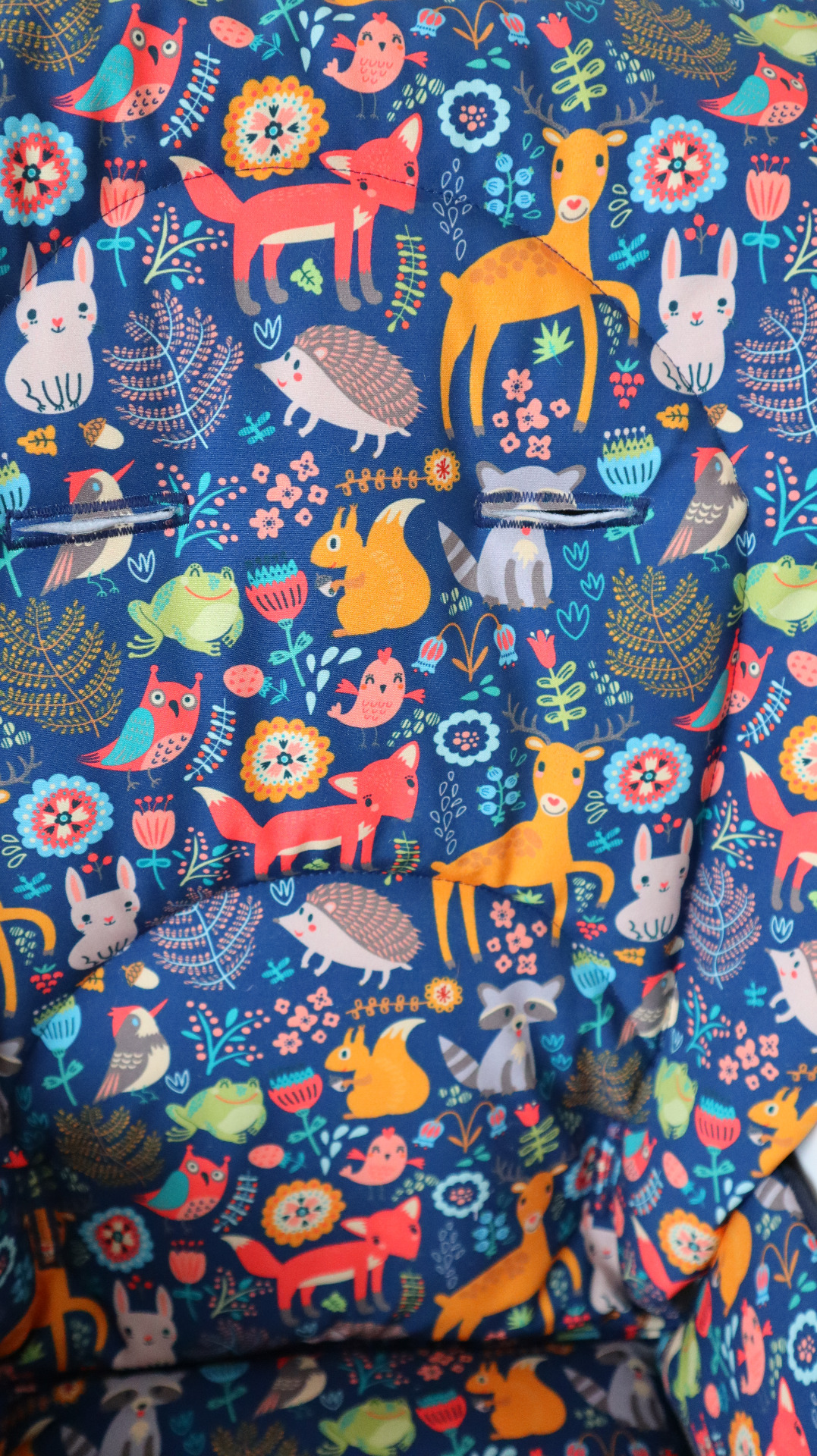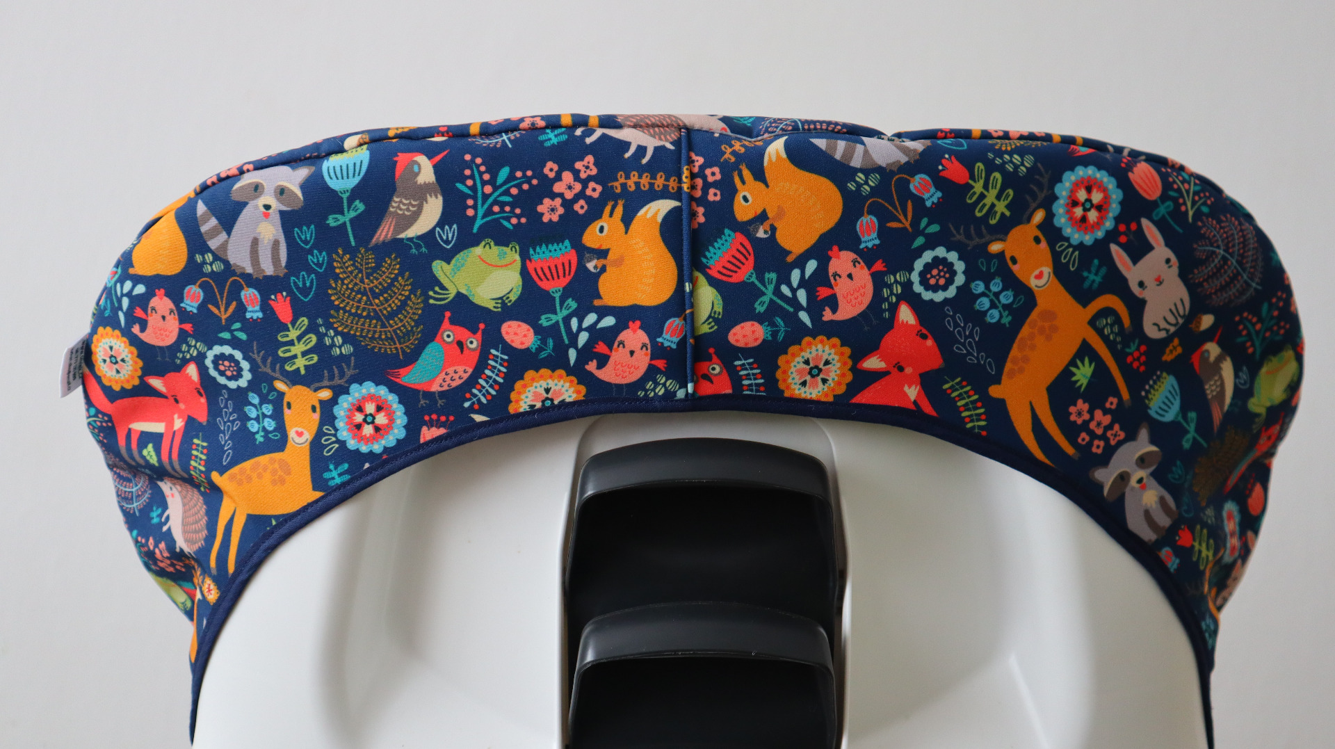 Pro šití potahů používám zimní softshell. Ze spodní strany je fleece, který je ale uvnitř potahu. Do kontaktu s dětskou pokožkou nepřichází, dítě se zbytečně v létě nezahřívá, nicméně tato vrstva fleecu zaručuje měkkost a pohodlné sezení.