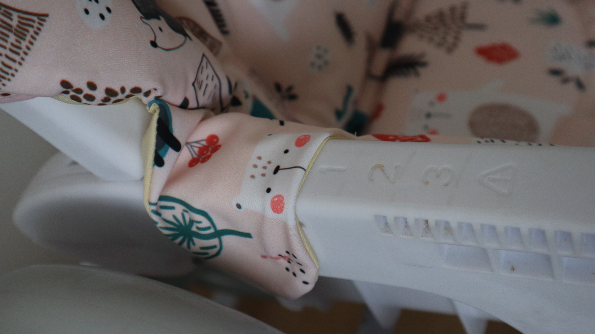 Pro šití potahů používám zimní softshell. Ze spodní strany je fleece, který je ale uvnitř potahu. Do kontaktu s dětskou pokožkou nepřichází, dítě se zbytečně v létě nezahřívá, nicméně tato vrstva fleecu zaručuje měkkost a pohodlné sezení.