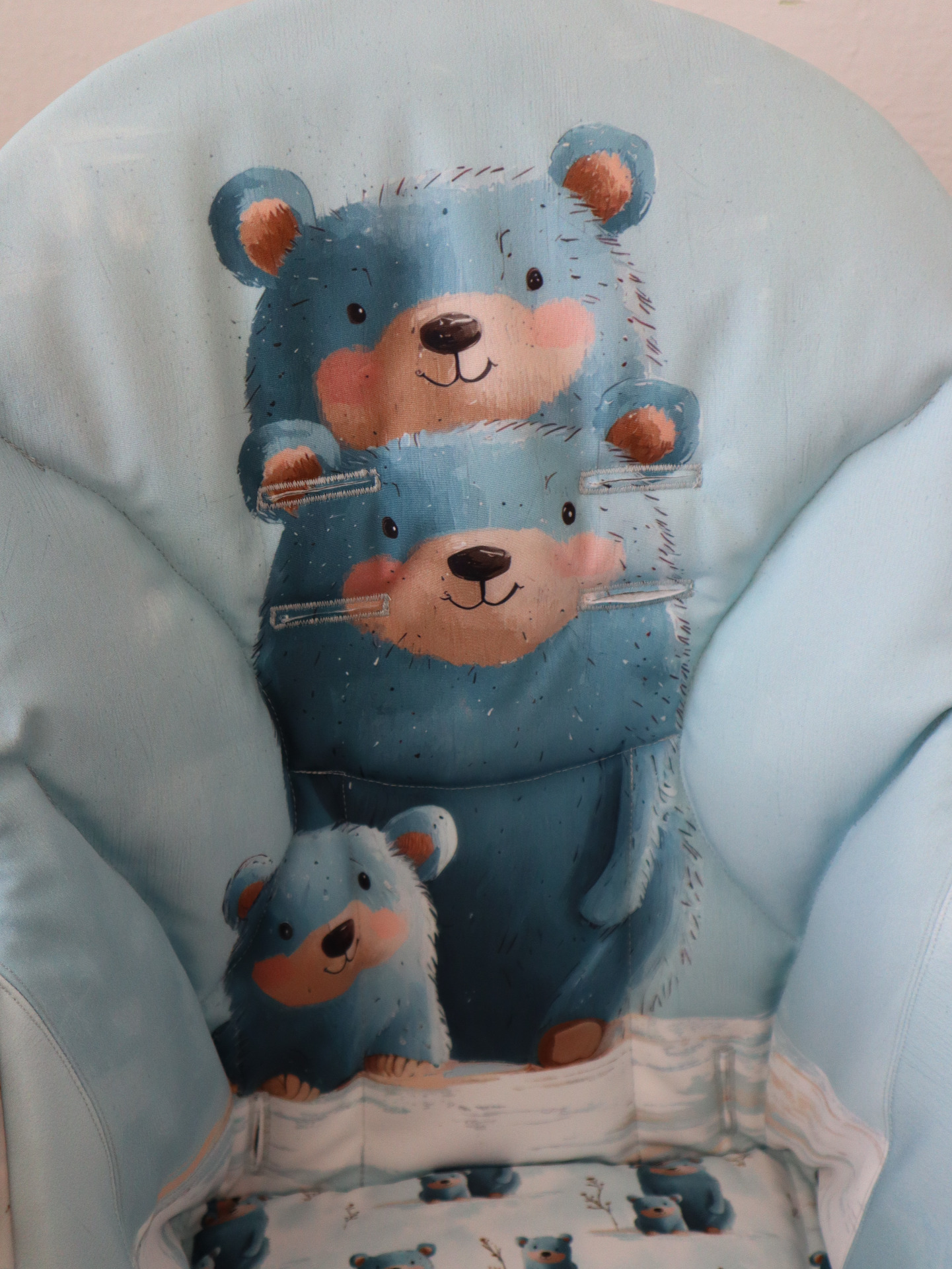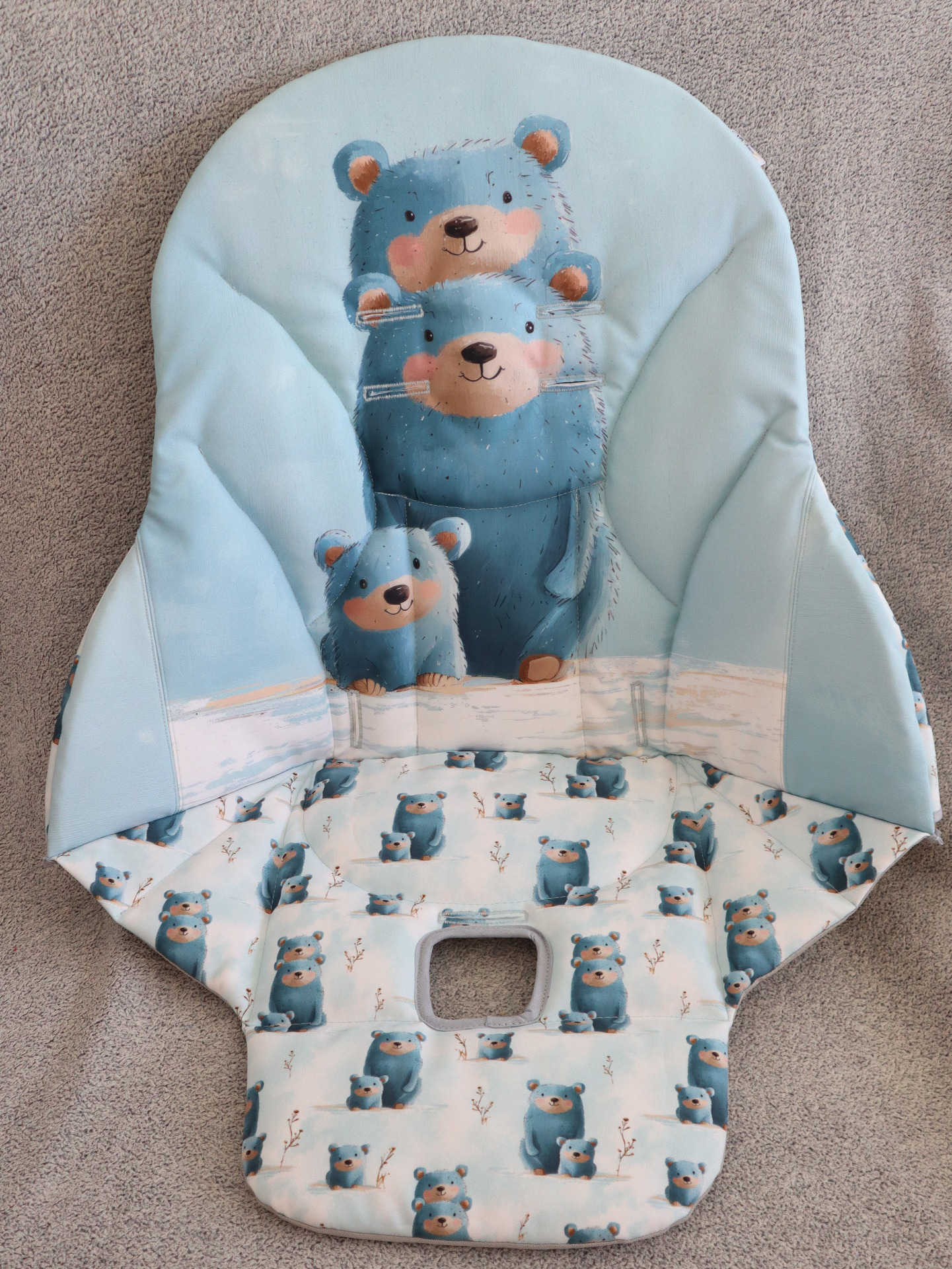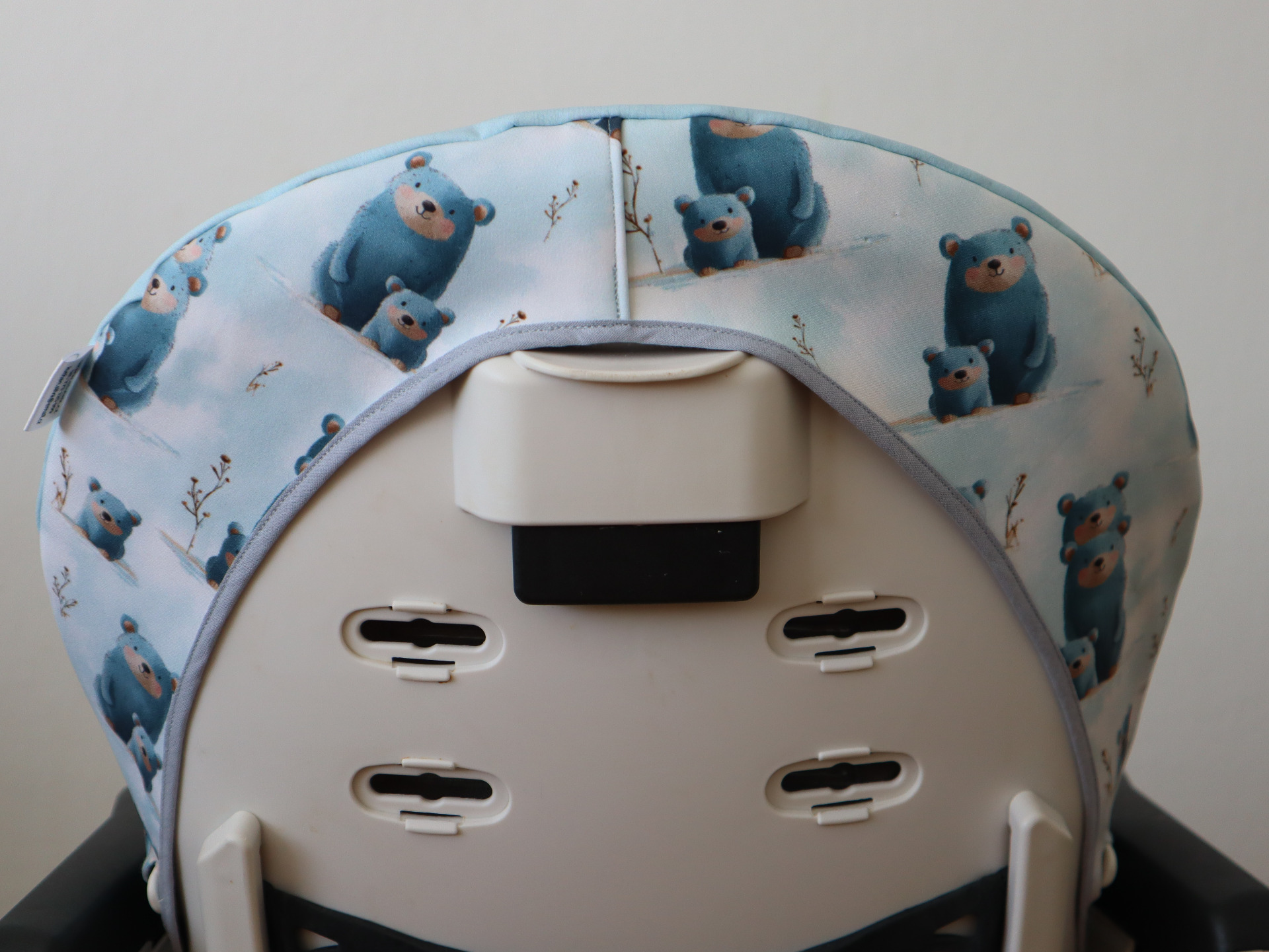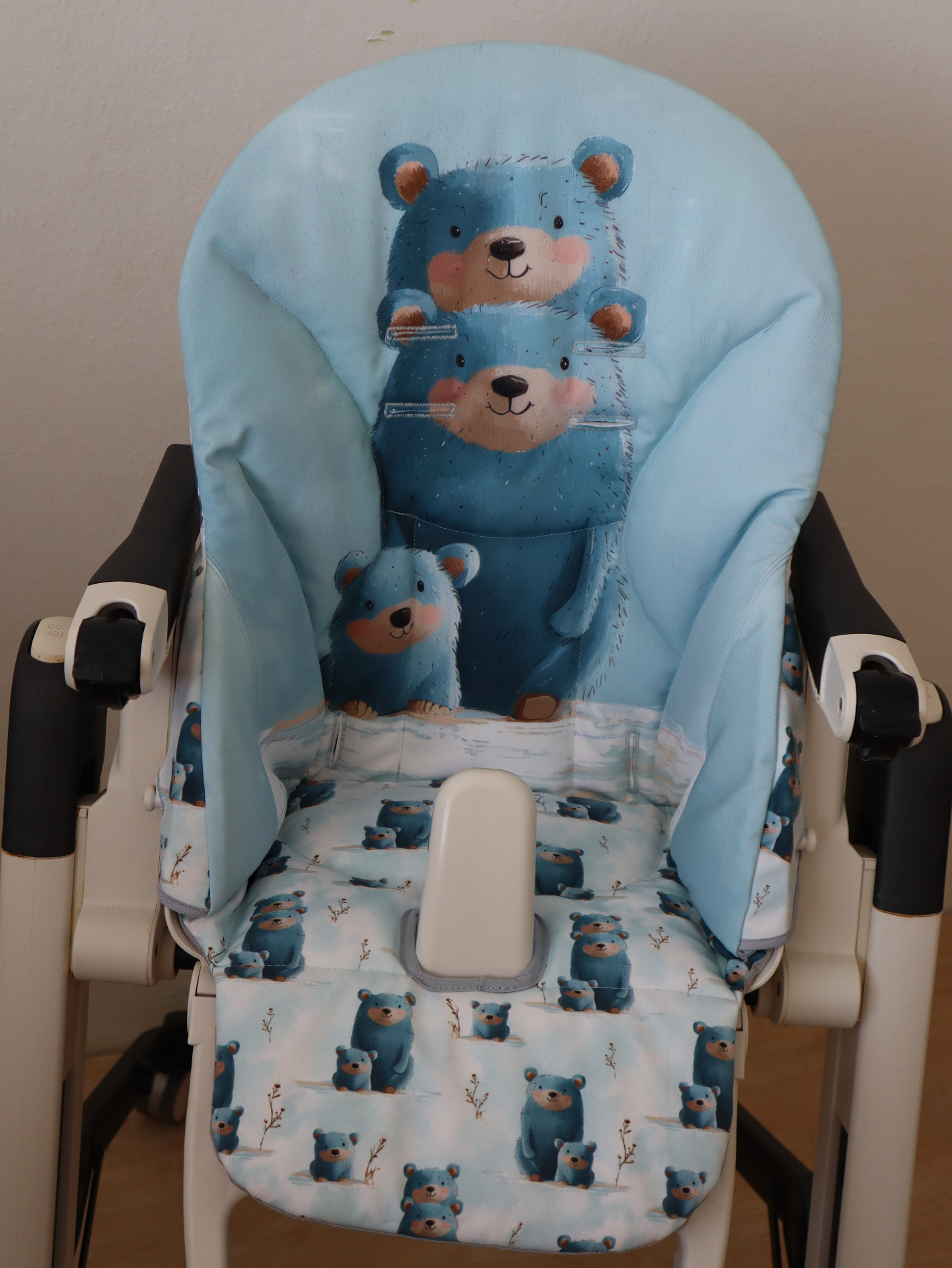 Pro šití potahů používám zimní softshell. Ze spodní strany je fleece, který je ale uvnitř potahu. Do kontaktu s dětskou pokožkou nepřichází, dítě se zbytečně v létě nezahřívá, nicméně tato vrstva fleecu zaručuje měkkost a pohodlné sezení.