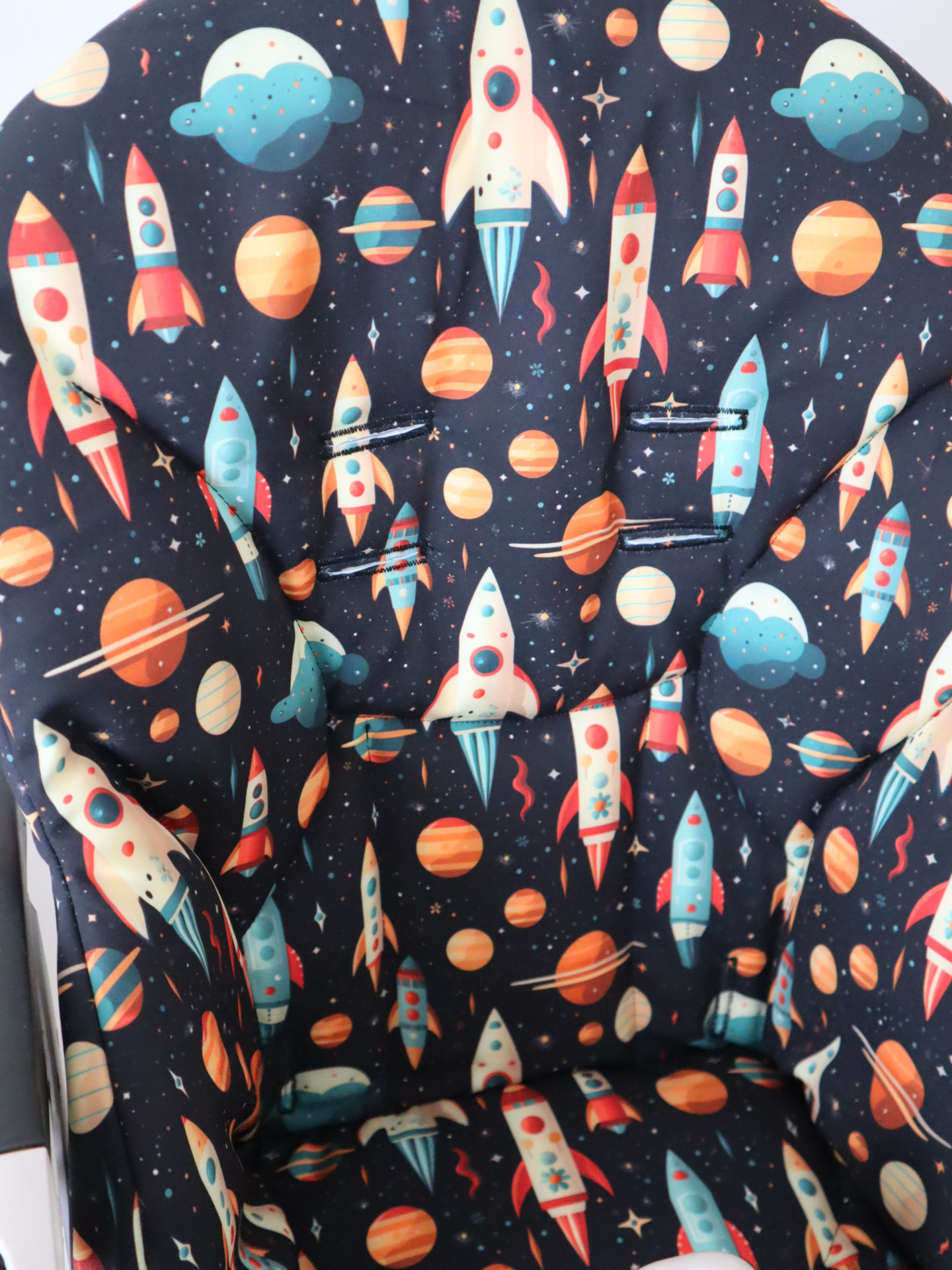 Pro šití potahů používám zimní softshell. Ze spodní strany je fleece, který je ale uvnitř potahu. Do kontaktu s dětskou pokožkou nepřichází, dítě se zbytečně v létě nezahřívá, nicméně tato vrstva fleecu zaručuje měkkost a pohodlné sezení.