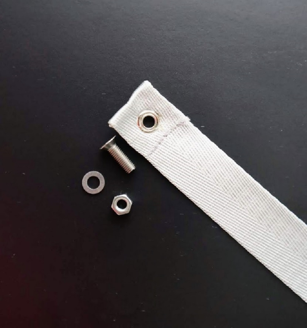 1. odmontovat klín v sedací části - drží ho dva šroubky. Pomocí nitě protáhnout popruh tak, aby byl skrytý pod klínem. Na popruh navléct (přes otevřený spoj) kovový polokroužek. Klín pak opět přišroubovat zpět.