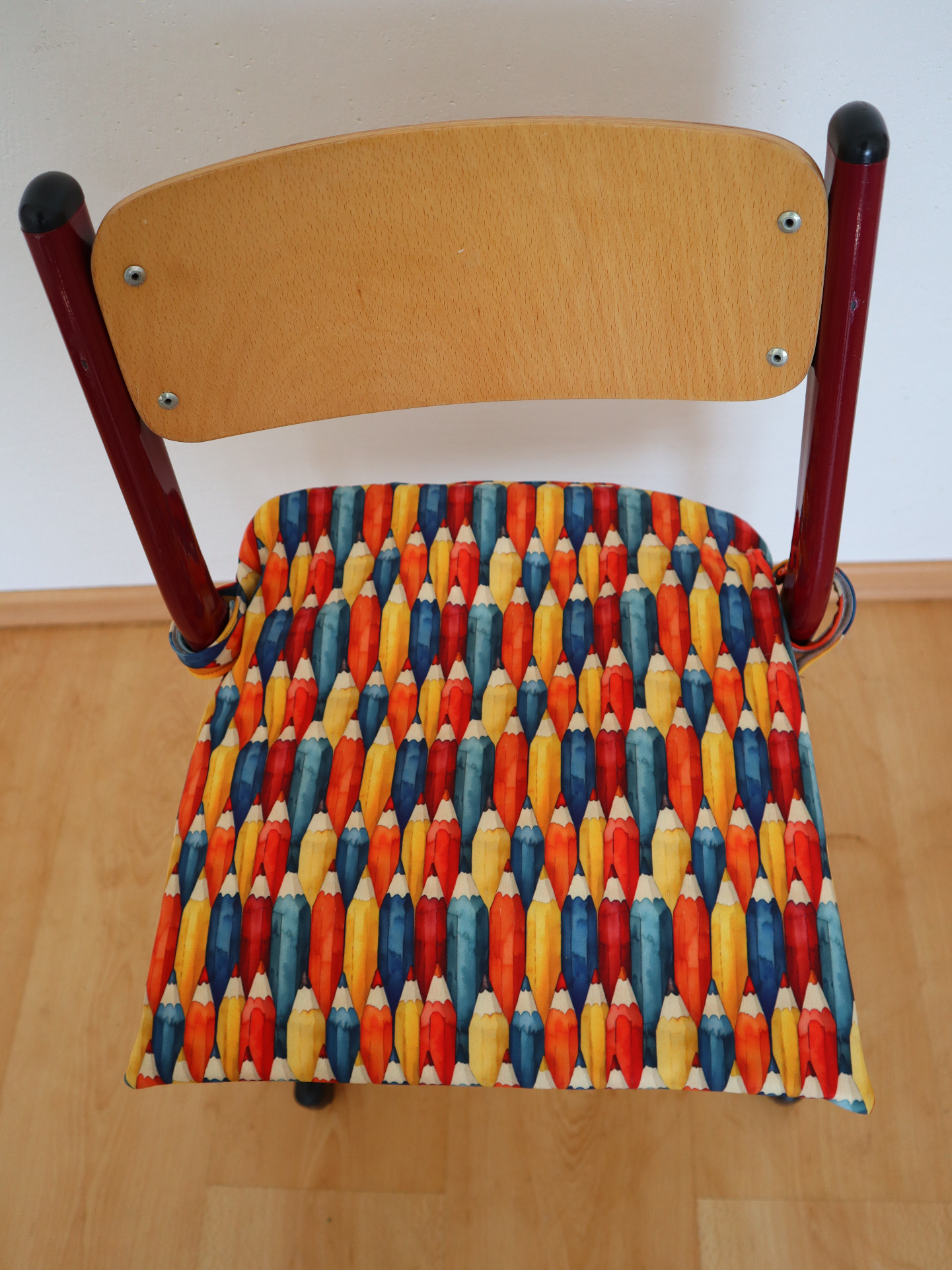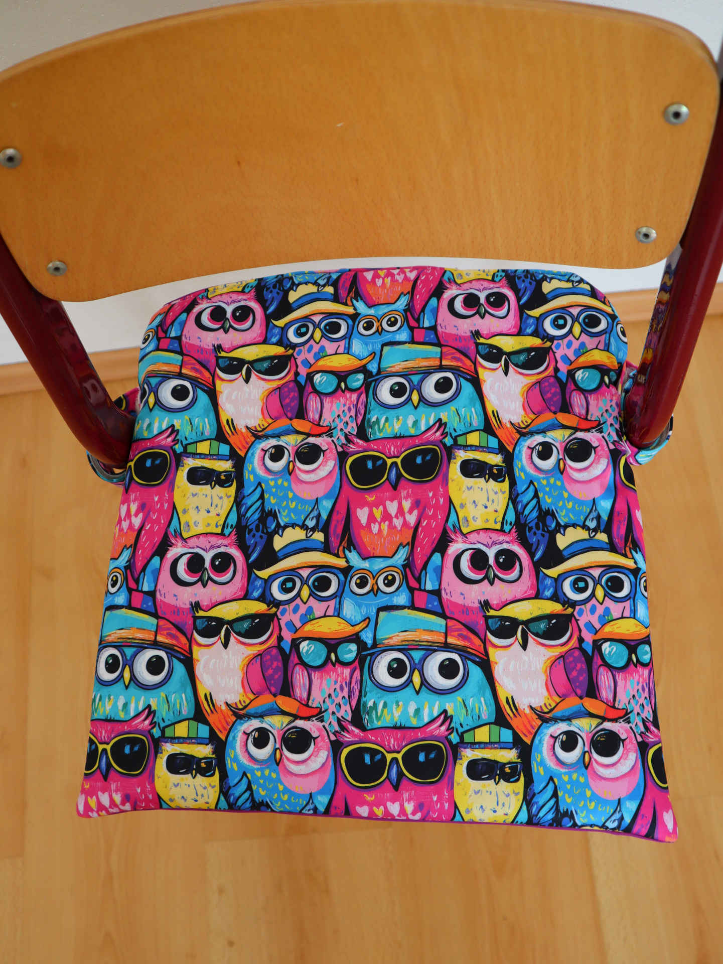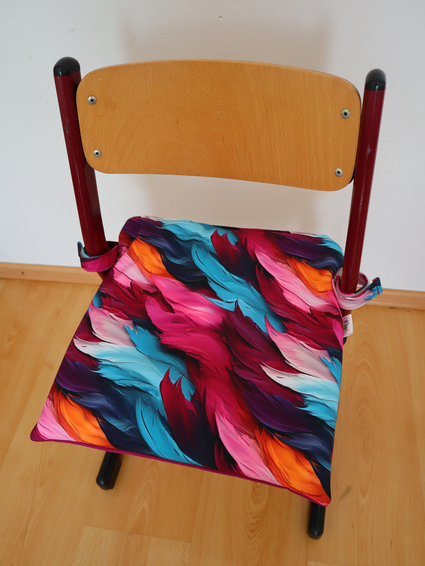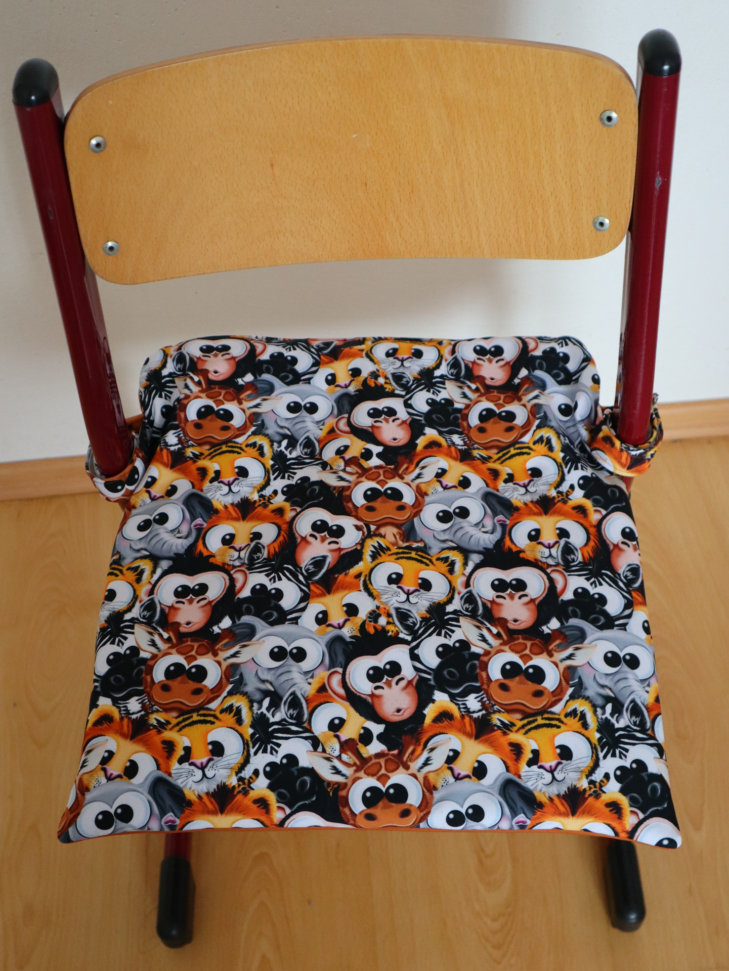 Podsedáky šité na míru na školní židličky (na fotografiích jsou židličky z I. stupně). Uchycení na suché zipy. Jedna strana s obrázkem, druhá jednobarevná. Obě jsou ze softshellu. Výplň antialergenní rouno.